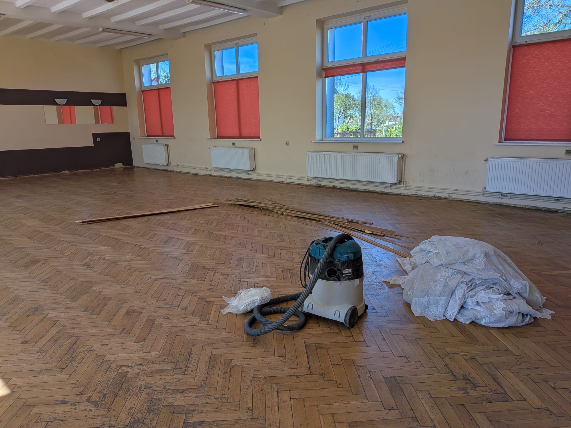 15 kwietnia 2026 roku Gmina Duszniki podpisała umowę z Wykonawcą, który wykona roboty budowlane oraz dostawy wraz z montażem w ramach realizacji Projektu pt. „Przystosowanie świetlicy wiejskiej w Podrzewiu dla stworzenia miejsca integracji oraz zagospodarowania czasu wolnego mieszkańców wsi”. Wykonawca - firma MKIT Mateusz Kajzderski z Pniew w ramach realizacji umowy wykona kompleksową modernizację sali świetlicy wiejskiej w Podrzewiu. Zakres prac jest szeroki i obejmuje: wymianę wewnętrznej stolarki drzwiowej, wykonanie sufitu podwieszanego, malowanie ścian, cyklinowanie i lakierowanie posadzki, wykonanie robót związanych z instalacją sanitarną, remont instalacji elektrycznych oraz odnowienie elewacji budynku. Ponadto, w sali świetlicy zostanie zamontowana klimatyzacja oraz dostarczone będzie nowe wyposażenie (stoły, krzesła, rolety okienne, projektor wraz z ekranem projekcyjnym i laptop). Całość realizacji projektu jest dofinasowana z Europejskiego Funduszu Rozwoju Regionalnego w ramach Programu Fundusze Europejskie dla Wielkopolski 2021-2027 Priorytetu 08 „Rozwój Lokalny Kierowany przez Społeczność (EFRR)” Działania 08.01 „Wspieranie rozwoju programowanego w Lokalnych Strategiach Rozwoju (RLKS)”. Celem realizacji projektu jest rozwój aktywności mieszkańców obszaru i integracji pokoleniowej na rzecz kapitału społecznego KOLD. Przedstawimy Państwu zdjęcia, które obrazują obecny stan sali świetlicy wiejskiej w Podrzewiu. Prace w świetlicy już się rozpoczęły.